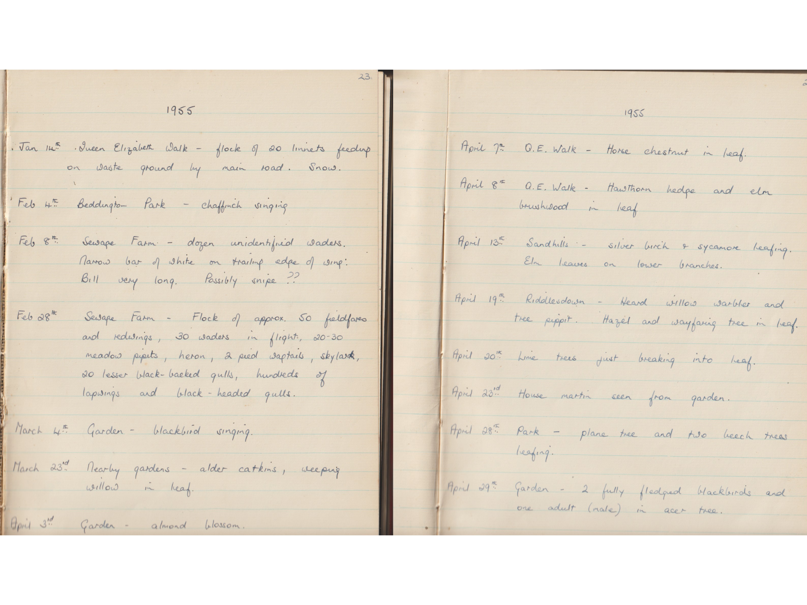 Here are pages from Jean Combes’ phenology diary from the year 1955.