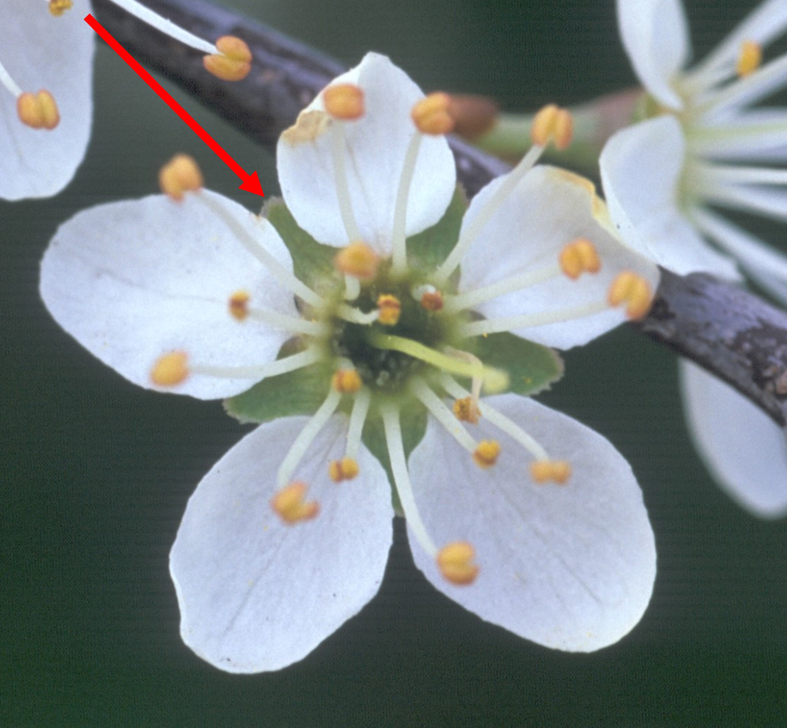 Cherry plum (Prunus cerasifera). The sepals of cherry plum flowers are reflexed (i.e bent backwards, see red arrow), whereas the sepals of blackthorn flowers are not reflexed (see above image). Cherry plum flowers a few weeks earlier than blackthorn. Image credit: Helge Klaus Rieder